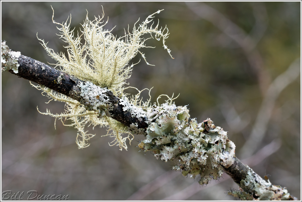 So what are the two lichens captured in the image above? These are my best guesses and I am far from an expert in lichen identification. The left-most lichen is the fruticose, bloody beard lichen – Usnea mutabulis. The other, ruffled lichen I cannot ID for sure. I should have collected some notes of it in the field. But, I have narrowed it down to either the salted ruffle lichen – Parmotrema crinitum or the cracked ruffle lichen – Rimelia reticulata. If you are someone who knows their lichen and can tell me what I have just through the information in this photograph, please let me know.