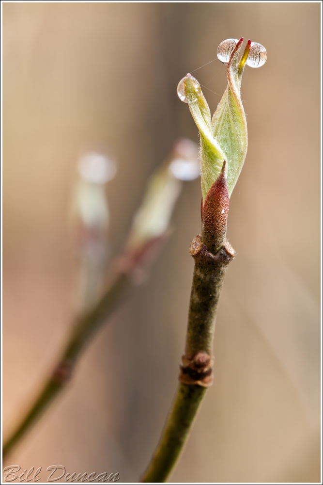 I took this photo on a recent hike in the Missouri Ozarks. This bush must have had two dozen of these emerging leaf buds, each with a drop or two from gutation. This phenomenon is seen when plants are growing in high humidity or in very saturated soils, like many parts of our region have been experiencing lately. Between the low light and the high macro magnification getting a sharp image of the foreground subject was tricky. I pulled out the reflectors to bring a little more light to the situation, but this only helped a little.