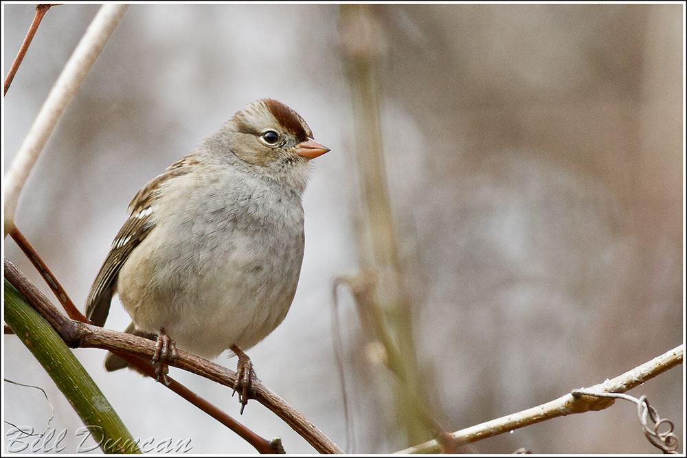 Compared to it’s close relative in the Zonotrichia genus, the White-throated Sparrow, the White-crowned Sparrow is a bravado. These guys, especially the juveniles like the one pictured here, are quite curious and bold. They will readily fly to the tops of the vegetation they are hiding in to get a better look and are quite responsive to pishing. I find White-throats to be cowardly in comparison and quite a bit more difficult to get a clear photograph or looks at. Happy snowy Monday.