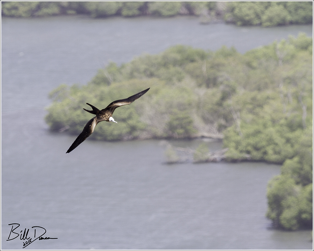 Abundant in Puerto Rico and across Caribbean coastlines, the Magnificent Frigatebird  is a seabird that feeds by catching fish on the wing.  This is a long-lived species.  The one pictured below is a juvenile.