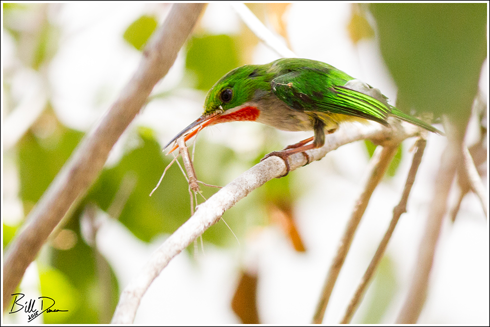 I would find these guys all over my travels in southwestern PR.  They are related to and behave somewhat like the Kingfishers, are slightly larger than a Chickadee, are nearly as bold as a Kingbird and as brilliantly colored as a Parrot.  I captured the one below as it tackled a stick insect.