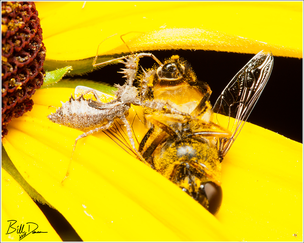 This Assassin Bug has captured a syrphid fly and is having himself a meal.