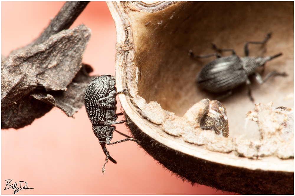 Almost reflexively, I pull the baby rattle-shaped seed pod from the stately White Wild Indigo (Baptisia alba) as I meander through Shaw Nature Reserve’s prairie trails. I can’t help it. I make sure the pods are always black, mature and any seeds left unravaged I simply help to disperse along my walk. But in doing this so often in the late summer and autumn for so many years I have come to notice that this common forb cannot disperse many seed. Because, inside the seed pods, like the one pictured above, I usually find multiple seed predators – the short-snouted weevils, Trichapion rostrum (Family Brentidae).