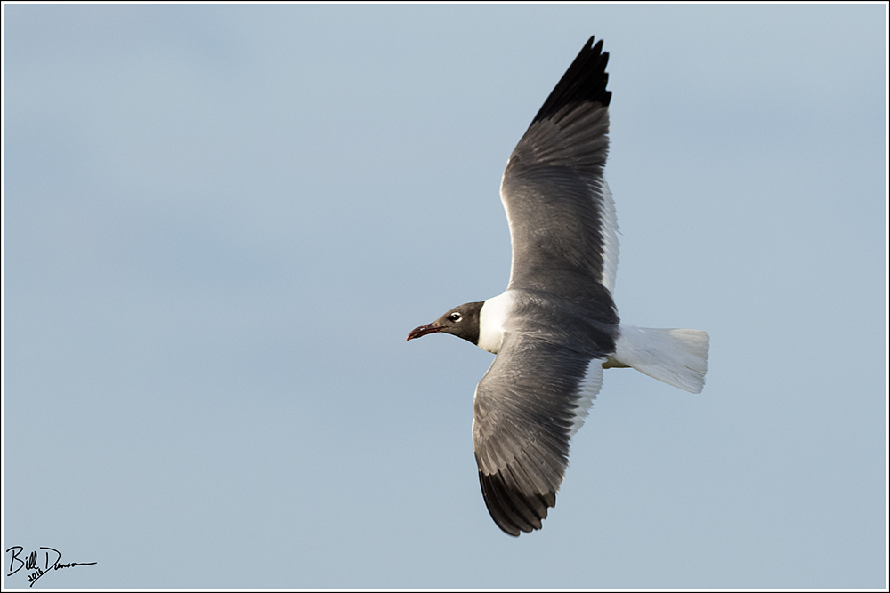 In summer plumage, this is obviously one of the easier gulls to identify. Largest of the hooded gulls, with red bill, legs and feet, slate-colored back and black primaries.
