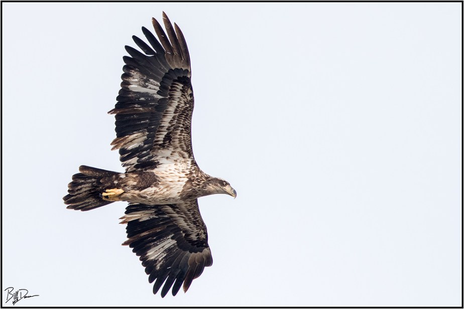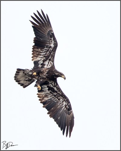 The bird pictured above is much closer to looking like an adult bird, showing the mostly white head and tail. I estimate this bird as being 3.5 to 4 years old.