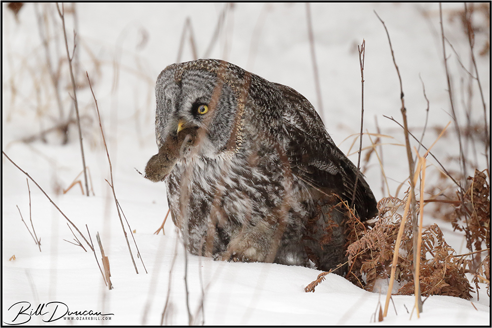 During December of 2019, Miguel, Dave and I were fortunate to have this Great Grey Owl successfully hunt and ingest a vole along the roadside in the Sax-Zim Bog. Here is what portions of the sequence I was able to capture.