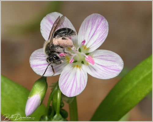 The spring beauty bee (Andrena erigenidae) is a mining bee (Andrenidae) that feeds exclusively on the pollen and nectar of C. virginica. In fact, the larvae of this species cannot grow optimally on any other pollen source. So, it may not come as a surprise that this was the most common bee I found foraging on the fields of spring beauty.