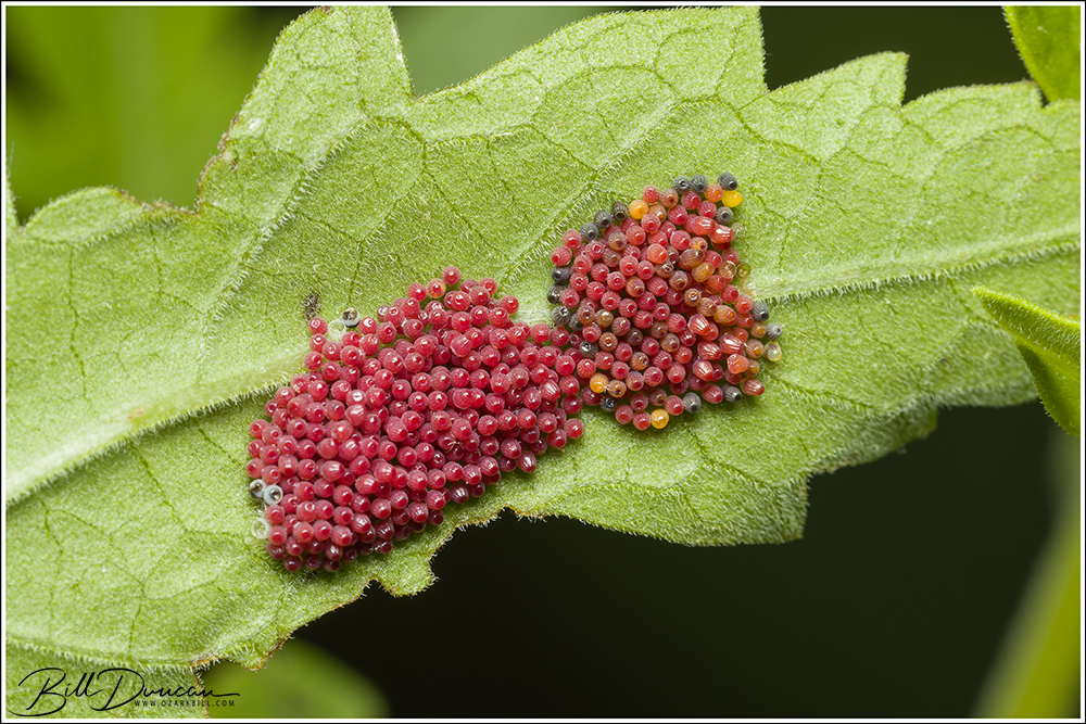 Thinking on this further, on what has been described of this species (read more below), this makes perfect sense. We were not likely to find larvae on P. canadensis, nor find the females depositing eggs. Eggs are typically deposited on A. grandiflora, whereupon the larvae feed until the end of the season, moving on to finish this stage in the spring where the feed on P. canadensis.