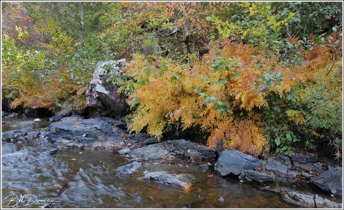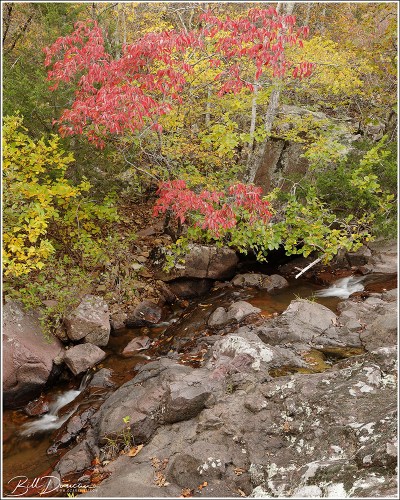 The tile-red rhyolite porphyry that makes up the majority of this streambed matches well against the warm tones of autumn foliage.