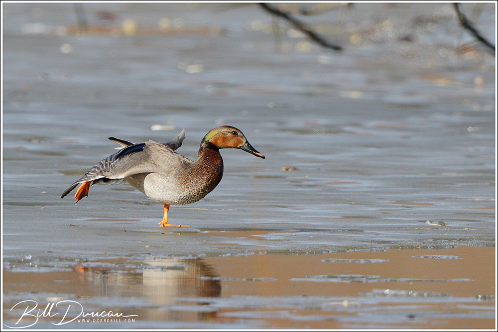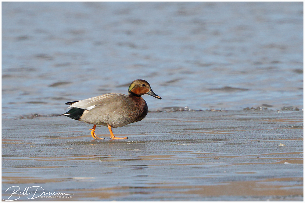 In the above photo, the blue speculum patch can be seen, coming from the Mallard. The fine lines of the Gadwall can be seen on the breast and sides. The head is a mixture of both species. Some green can be seen towards the back of the head, although this could only be seen at just the right angle to the sun. The bill is also a mix of the yellow Mallard’s and the all black Gadwall. In my opinion, the feet are more reminiscent of the color of the Gadwall’s feet.