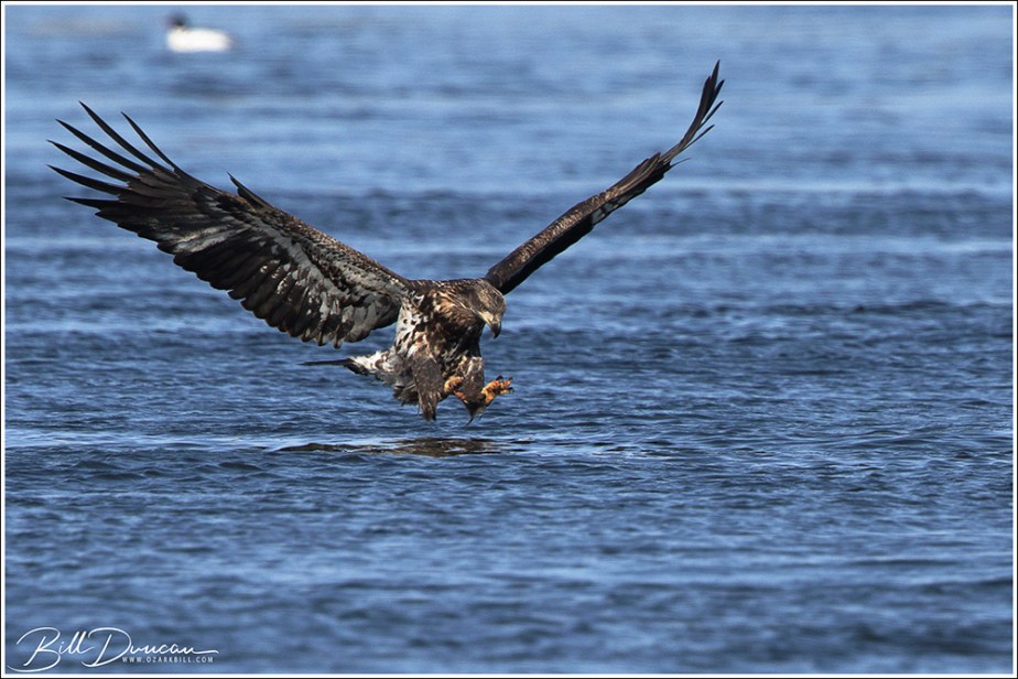 We actually had a couple weeks of a deep freeze, old-fashioned winter during the 2020/2021 season. It was enough to get a lot of ice on our rivers and lakes but it didn’t seem to be quite long enough to bring the eagles into Lock and Dam #24 in big numbers. A couple friends and I tried during the last couple days of the deep freeze and although we had fewer than 12 birds, there were opportunities that made it worth our time. Here are a couple photos of a juvenile eagle (a 1.5 to 2.5 year old bird) that I captured as it came to the water to catch a fish that was stunned following its passage through the dam.