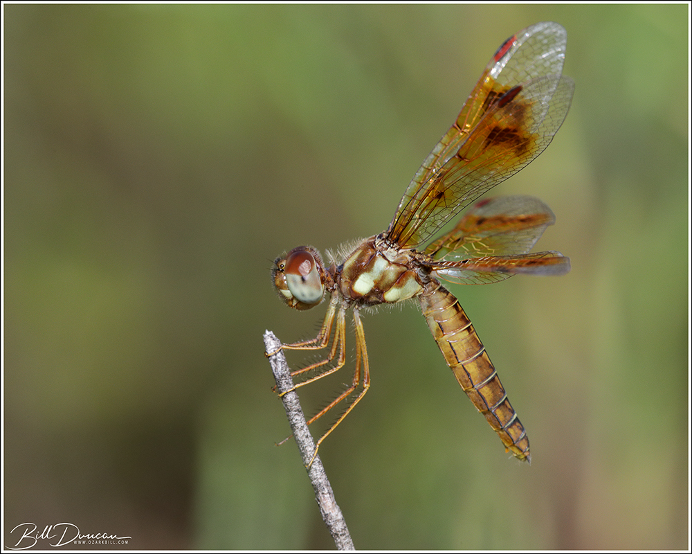 The eastern amberwing (Perithemis tenera), is a small member of the Libellulidae family of dragonflies. Along with its coloration, it apparently rests and behaves like wasps in which they mimic. This individual was found at Sand Prairie Conservation Area in Scott County, MO.