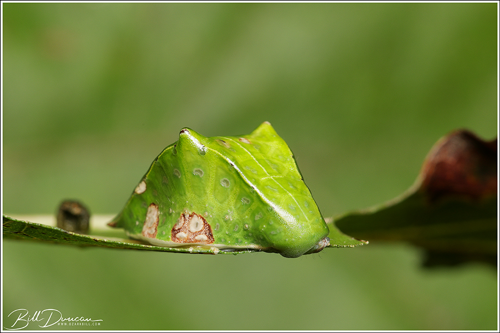 Prolimacodes badia (Skiff Moth) Hodges#4671. Until looking closely at this photograph, I never noticed the whisker-like setae these caterpillars sport. Freshly deposited out-of-focus frass for scale.