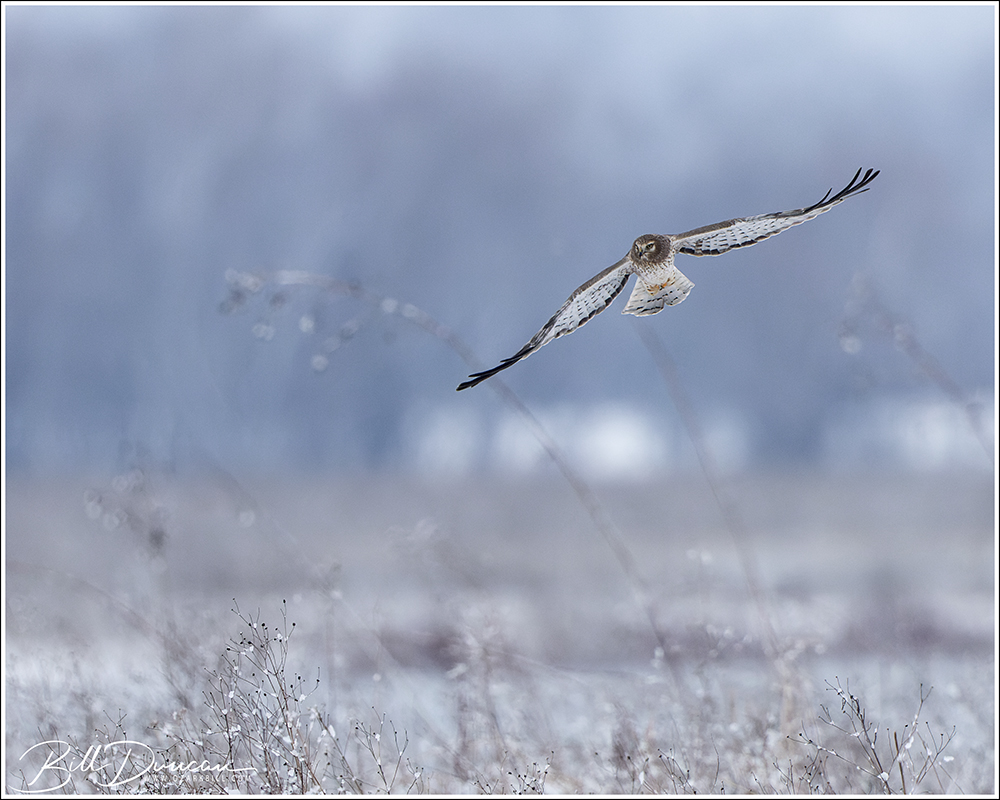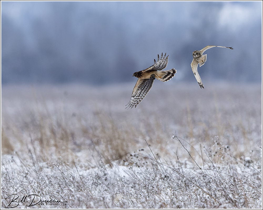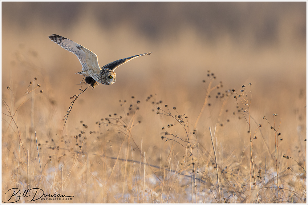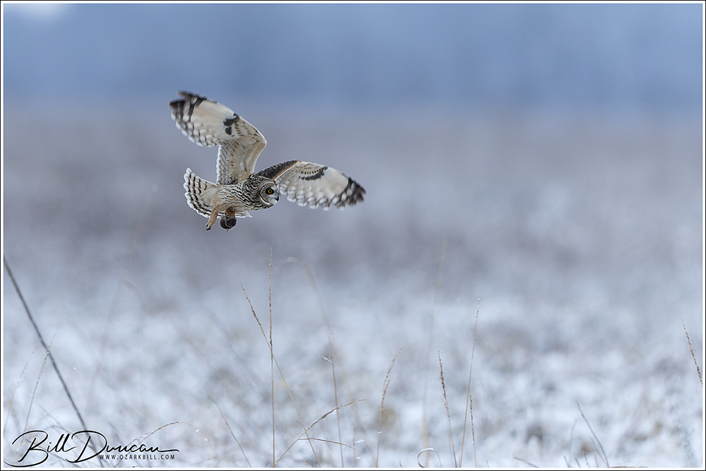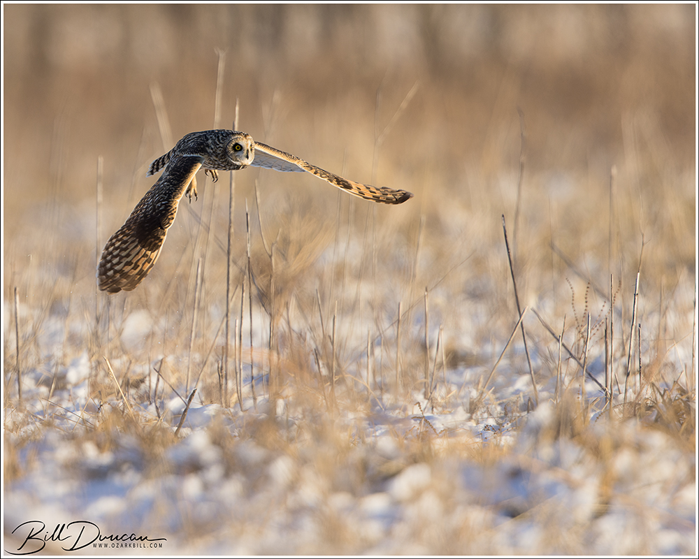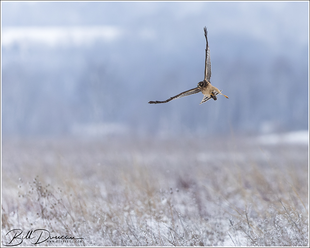 Whenever a Short-eared Owl tried and missed its intended prey, it would immediately shake the snow and other materials from its talons. Settings: 700mm focal length, 1/2500 sec., f/5.6, ISO-1000.