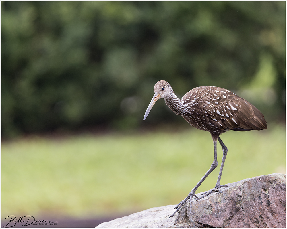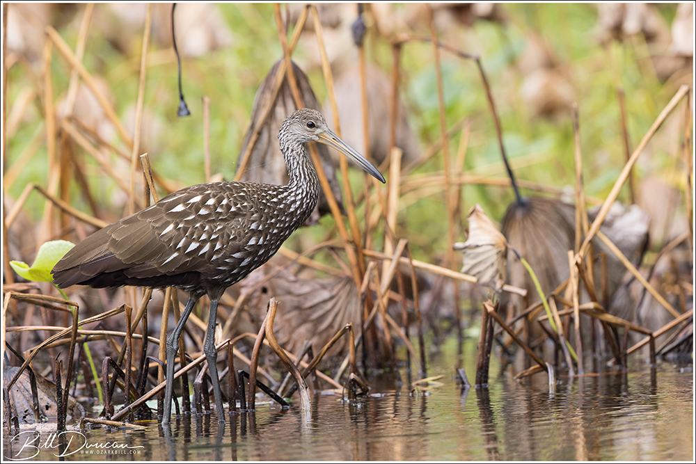 The Limpkin looks like a heron in appearance, but is actually the only extant member of its own family, the Aramidae, and is actually considered most closely related to the rails. It is also unique in feeding primarily on apple snails but will feed on other types of snails, freshwater mussels and clams and small aquatic arthropods like crayfish as it forages through its preferred habitat of brushy swamps and marshes.