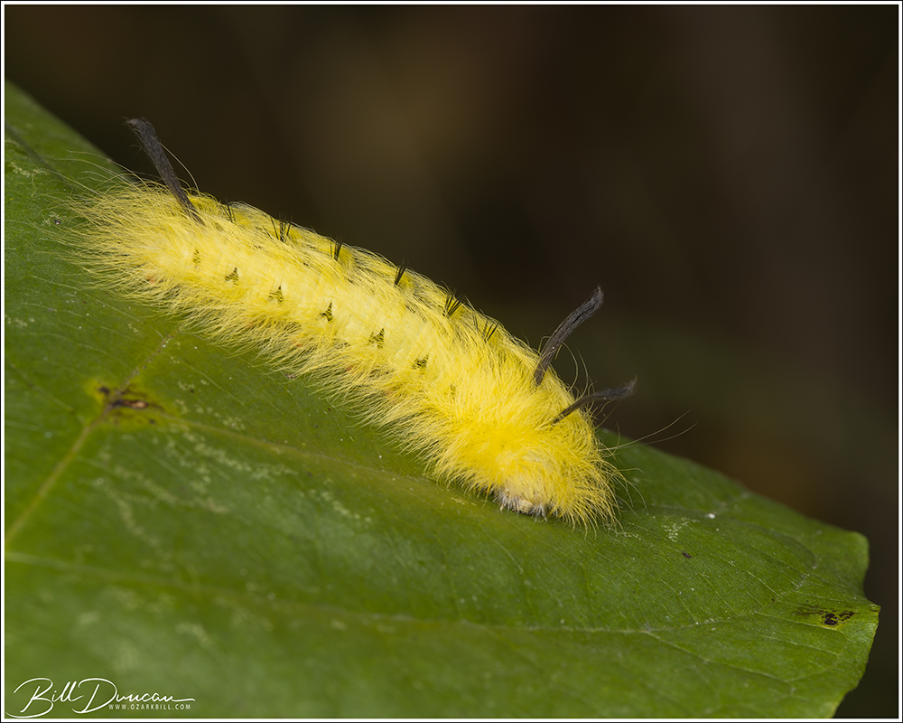 Perhaps because they are so conspicuous, we often have luck finding the cats of the beautiful Apatelodes torrefacta (spotted apatelodes moth) in the Apatelodidae family. These come in two flavors – vanilla white and the more pleasing lemon chiffon pictured here.