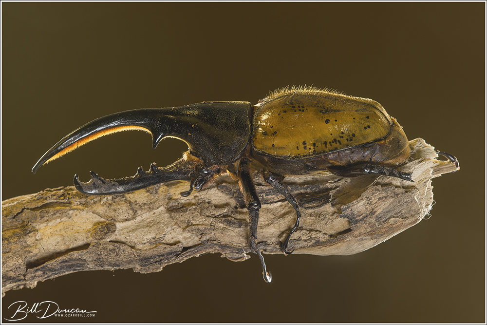 (Phalacrognathus muelleri) F. Lucanidae. This beetle is found in northern Australia and New Guinea. The mites that can be seen on this beetle do no harm to it. They tag along to pick up a free meal from their sloppy host.