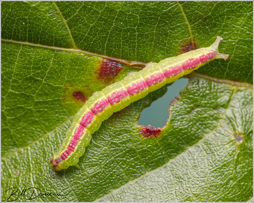 Notes: I found quite a few of these caterpillars while looking through buttonbush hoping to find Harrisimemna trisignata. I struck out on finding my target species, but was happy to find this one that I had not known about before. Of the three dozen or so individuals I came across, only a few of the largest, which I assume to be the ultimate instar, showed this bright fuchsia middorsal longitudinal band. All others were smaller and were plain green in color with no obvious lines or bands. I have noticed a propensity for buttonbush to show anthocyanin coloration in aging leaves as well as in galls produced by gall mites (Aceria cephalanthi). I suppose this coloration in the caterpillar could be something of a cryptic coloration to help blend into the leaves of a late-season buttonbush?