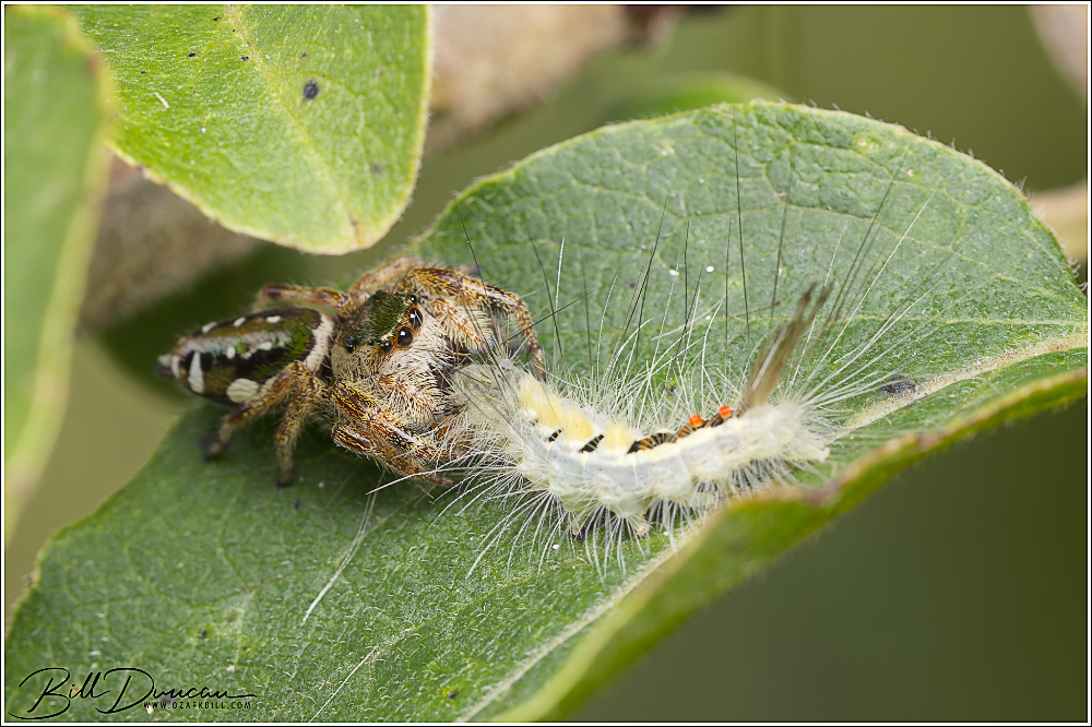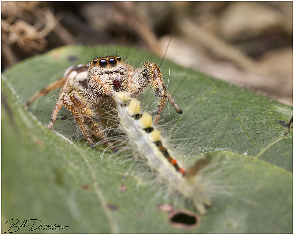 From 2024. I came across this female salticid (Paraphidippus aurantius) that had made a meal from a caterpillar of this white-marked tussock moth (Orgyia leucostigma).