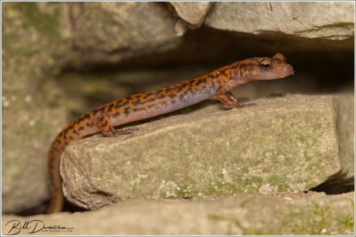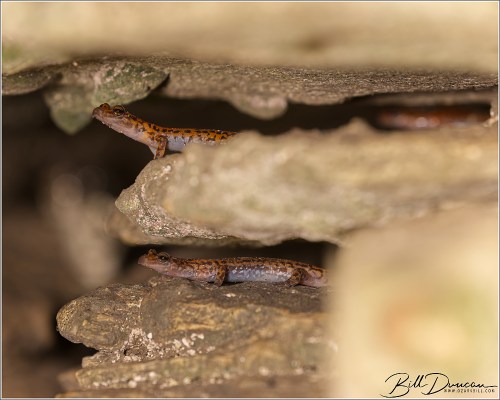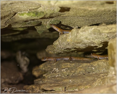 A short ways from the main road, we came across a small grotto. Looking closely with a light, I was able to find at least five cave salamanders resting on different shelves. After about 15 minutes on my knees, working out how to best light and photograph these guys, I finally focused my attention towards the back end of this small cave. There I noticed a medium-sized cottonmouth with its head raised that was apparently watching me the entire time, about a foot or so behind the salamanders.