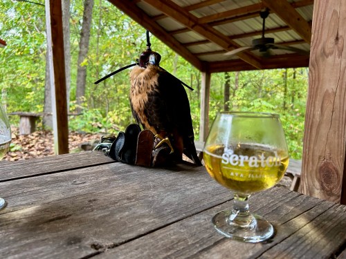 Afterwards, the group headed to one of my favorite breweries – Scratch in Ava Illinois. Stacia brough one of the Falcons to the outside location and we had a most unique partner to go along with our wood-fired pizzas and beer.