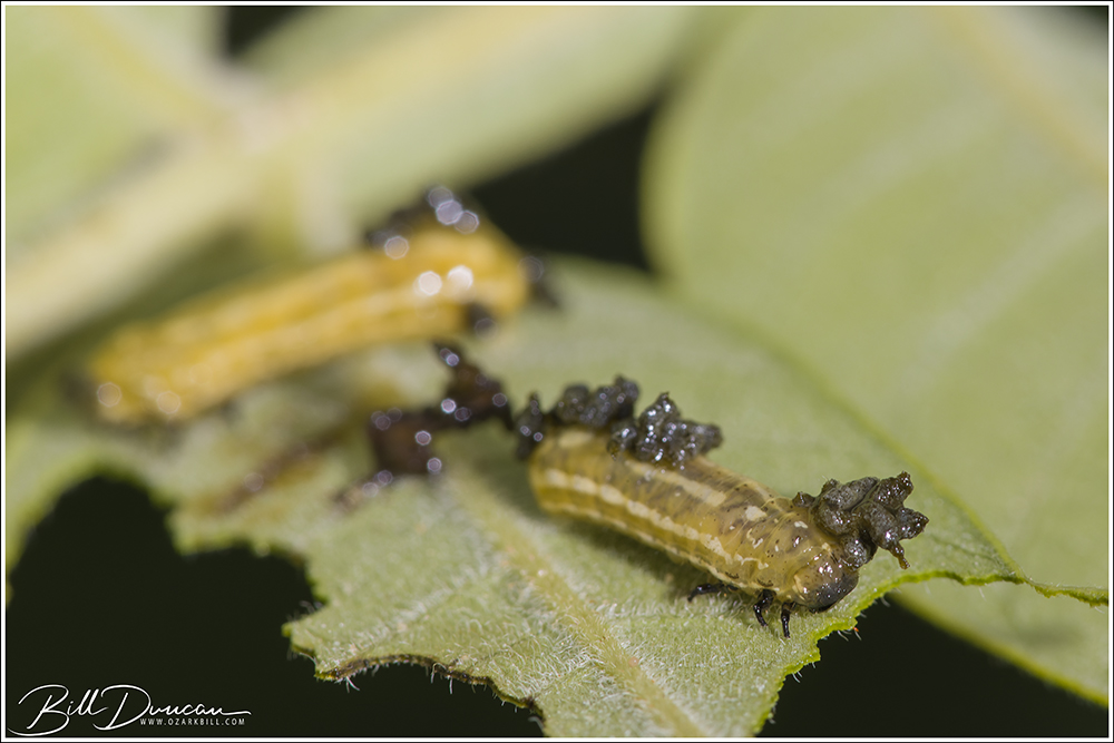 Today’s post features lovely little Chrysomelid beetle larvae. These were found at Taberville Conservation Area in St. Clair County, MO in June of this year. Blepharida rhois – the sumac flea beetle, create “shields” by retaining their feces as a means of protection from would-be predators. It has been discovered that chemicals from their sumac (Rhuss spp.) host plants, along with partial metabolites from the digestive process, act as swell deterrents in avoiding ant predators. When fed a diet of lettuce, the shields’ protective abilities were lost.*
