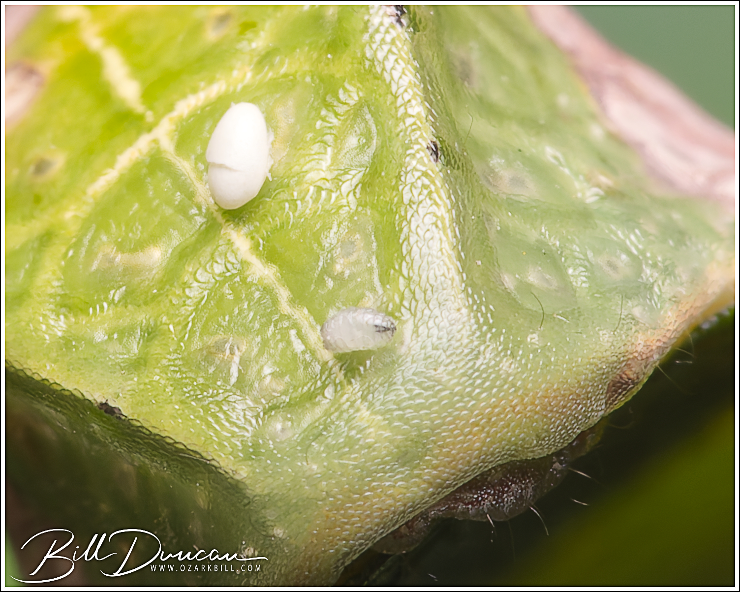 Notes: This poor cat is host to a tachinid fly larvae. A closeup image is included showing the egg as well as the larvae that has pierced the skin of the caterpillar in order to breath.