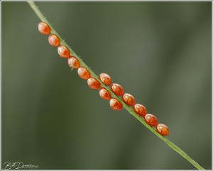 About a week ago, I noticed these golden drops on the leaf of a Liatris spicata (marsh blazing star). After taking a few photos in situ, I decided to collect the leaf and see what the hatch might be. I figured it was a hemipteran of some sort and after a little research, I narrowed it down to the Coreidae family, or ‘leaf-footed bugs.’ If you can identify these to any degree of higher specificity, please let me know.