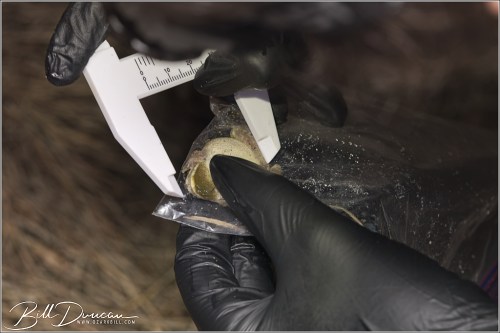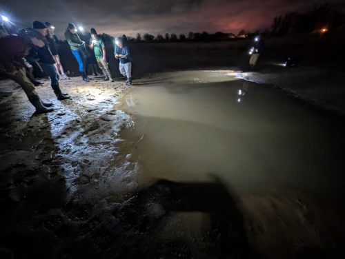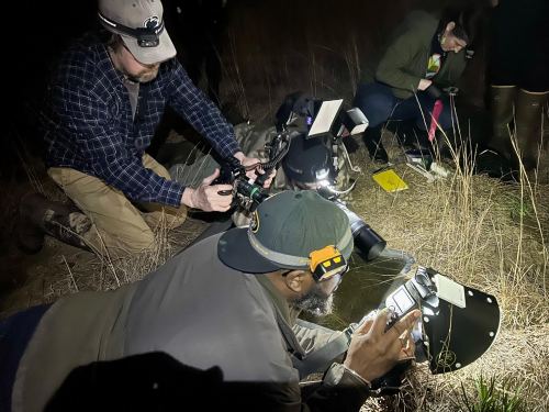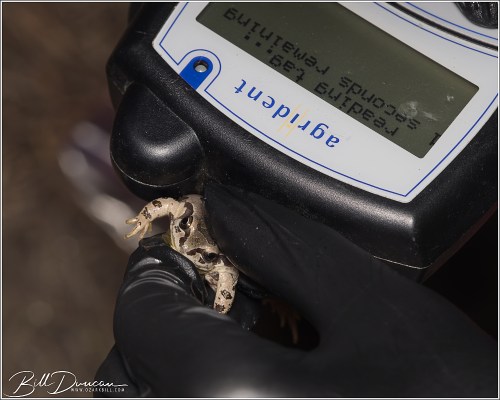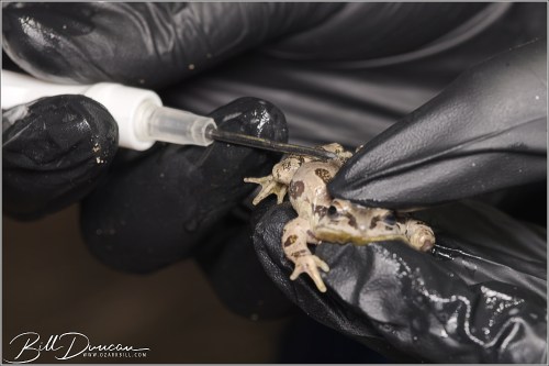 Getting photographs was not the primary reason Rick and his students were out on this fantastic evening. The biologists at SIUE are using mark-recapture techniques to study population demography and spatial activity, as well as the frog’s feeding behavior, locomotor behavior, and diet. It was fascinating to watch the students insert the smallest available PIT (Passive Integrated Transponders) tags in order to identify individual frogs in order to monitor their growth, movement and other characteristics over time.