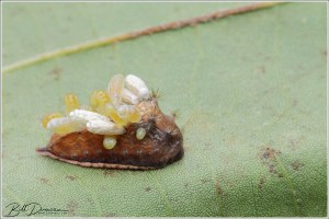 Sarah found the following poor creature. Although you can’t help but feel sorry for it, I was glad to capture this natural history story. This little one was gregariously parasitized by approximately 15 braconid wasps, likely from the Microgastrinae subfamily.