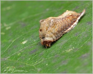 The next slug to make your acquaintance is the Red-crossed Button Slug. This species is quite similar to one or two others as both larvae and adult, but given that most lists I have seen from Missouri list this one and not the others, I am pretty confident in this ID. This species lacks the stinging, protective hairs, going instead with a more camouflage approach of looking like a bit of leaf blight as it passes over leaves of oaks, hickories and quite a few other known woody, deciduous host plants.