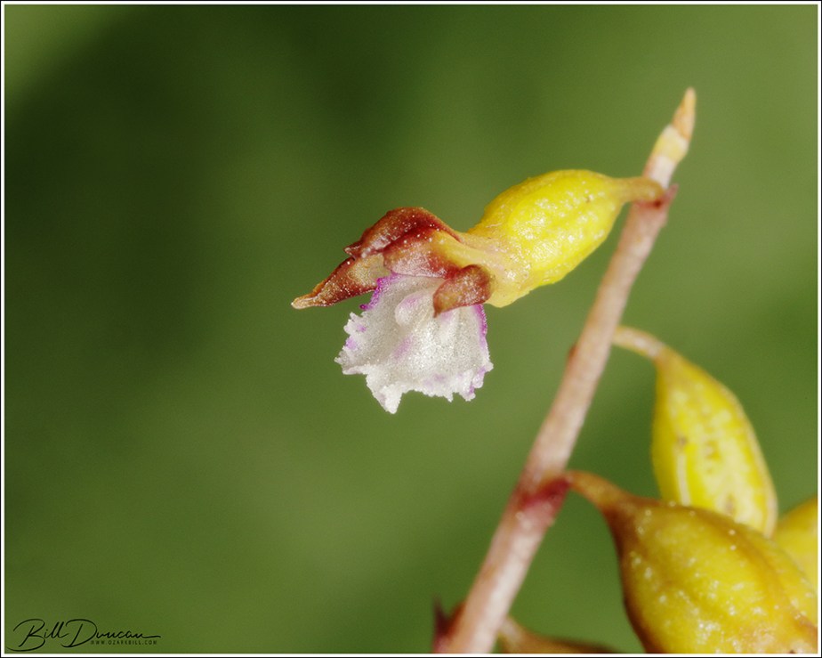 A rare open flower of Corallorhiza odontorhiza (autumn coralroot). Most plants of this species produce cleistogamous flowers that do not open, thus facilitating self-pollination.
