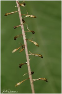 Chasmogamous flowers of Corallorhiza odontorhiza with obvious swollen ovaries.