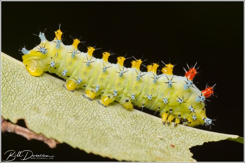Notes: Part spider and part bird dropping, this caterpillar is absolutely astounding. Note the empty head capsules that the caterpillar retains with each successive molt. It has been shown that these caterpillars use these to thrash at potential parasitoid wasps and flies that approach while attempting to deposit eggs on their would-be hosts.