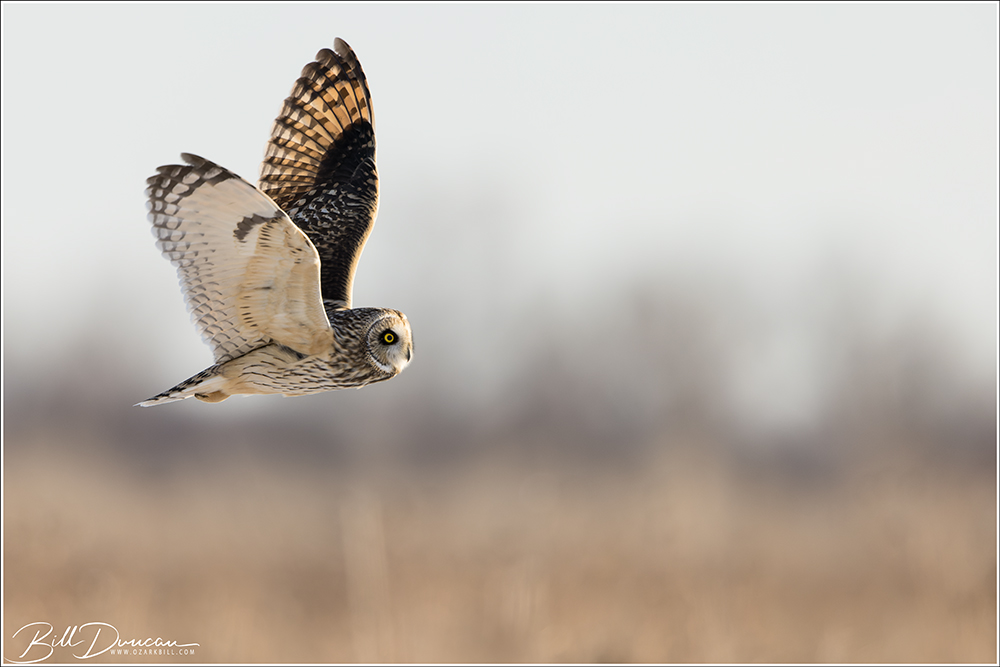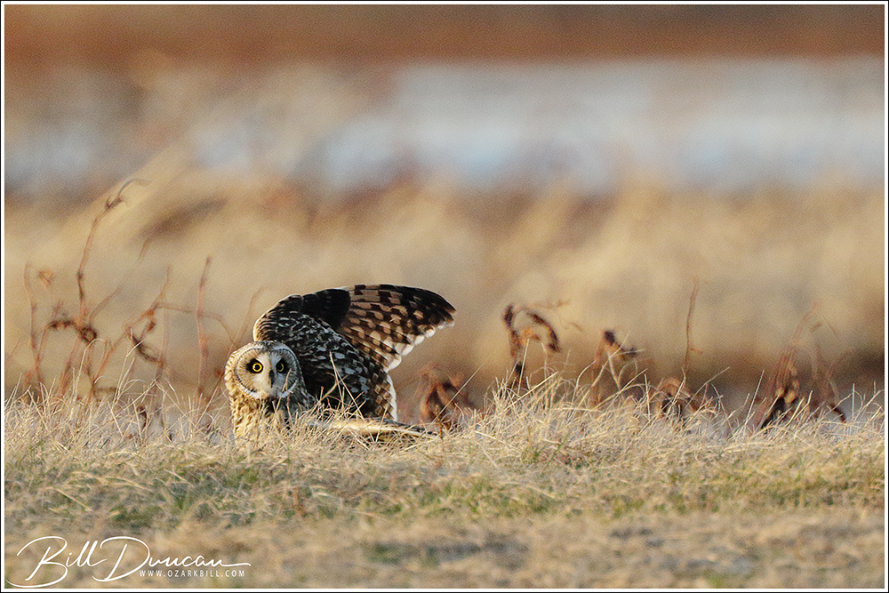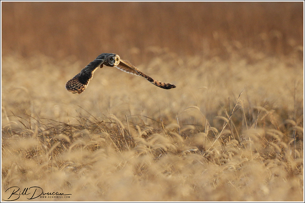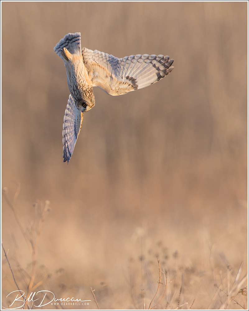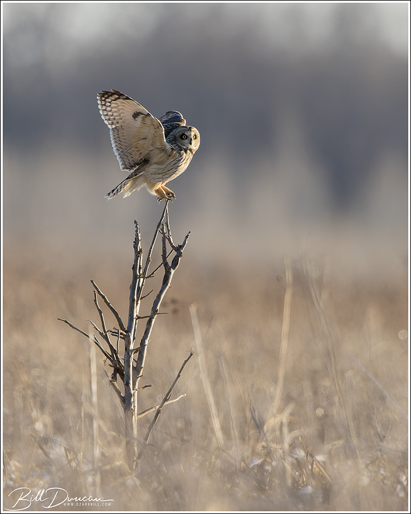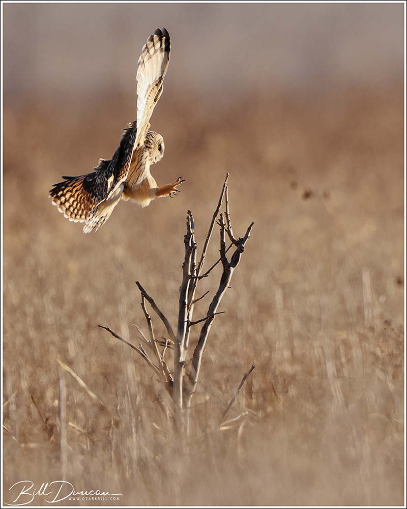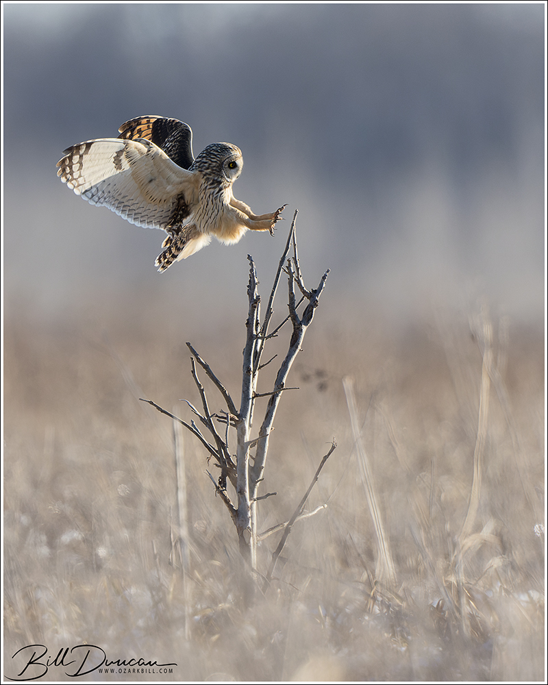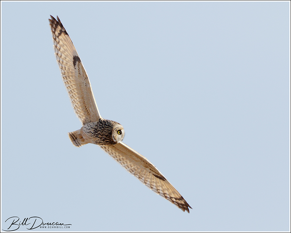 Another thing that makes Short-eared Owls so fascinating to observe is their vocalizations. These birds make sounds in a variety of ways. First, is their primary “hoot”. I have never heard this in person because this is primarily used by males in advertising for mates and establishing territories in the nesting season. You can, however, hear the barks and screams given by both males and females on their wintering grounds. The screams seem to be primarily given while in flight and the barks can be given in flight or while perched. I do not know the purposes of these two call types but will put this on my list to research. Another sound these birds deliver is the wing clap. This seems to be primarily used by males in their courtship flights and I have not observed this yet in Missouri.