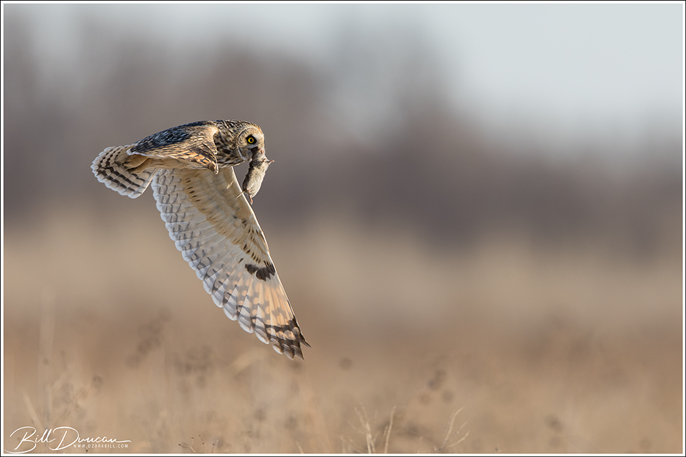 Yes, technically, the SEOH has developed more of a nocturnal habit and the NOHA is more active in the day. However, both species are highly crepuscular (active near dawn and dusk) and the SEOW is one of the most diurnal owl species, routinely hunting during daylight hours. They also use the same prey sources – primarily feeding on small rodents like mice and voles in winter. Additionally, both species have similar hunting strategies of flying low over the prairies, meadows and agricultural fields, using both their keen sight and hearing to locate their favorite scuffling mammals.