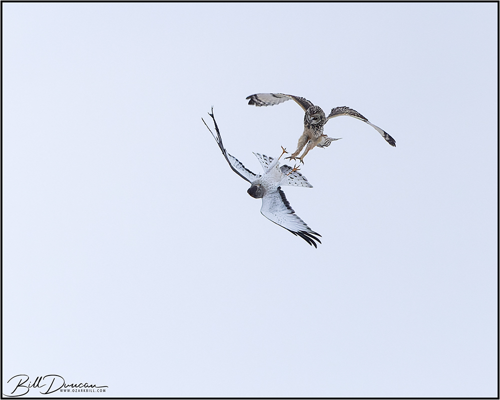 I would love to know how many thousands of years this struggle has been going on. The Short-eared Owl (SEOW) and Northern Harrier (NOHA) are separated genetically by millions of years, currently existing in separate orders. The SEOW belongs to the Strigiformes and the NOHA falls within the Accipitriformes. However, they have evolved to have similar lifestyles that have placed them in similar niches and thus, pushed them into direct competition with each other.