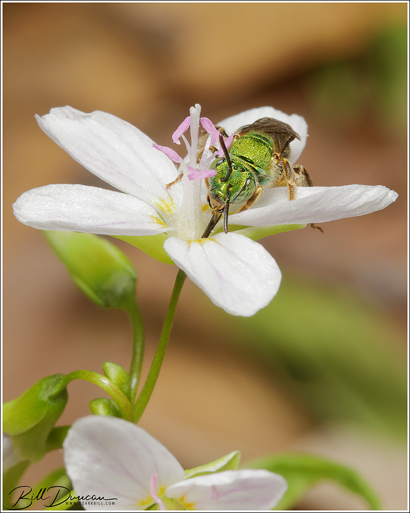 Photographed in April, this Agapostemon (either sericeus or splendens) bee is seen visiting blooms of Claytonia virginica (spring beauty). Agapostemon comes from two Greek words – agapetos, meaning beloved, and stemon, for stamen – these referring to their obvious fondness and attraction to flowers, particularly those in the Asteraceae. We can tell this bee is female because males of this genus have yellow and black striped abdomens.
