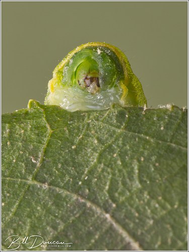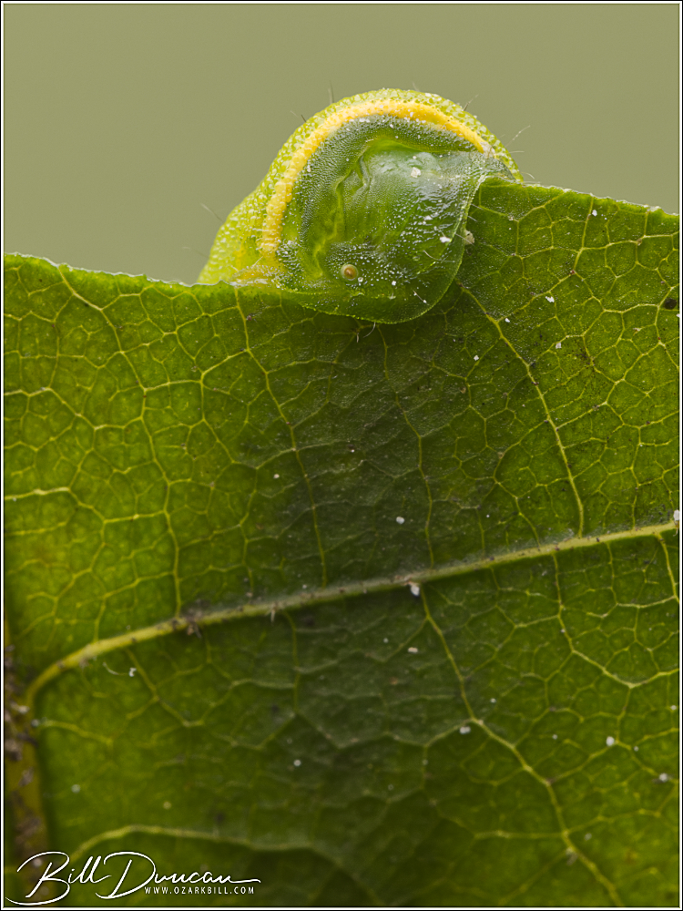 A look at the fleshy thoracic segment that covers the caterpillar’s head. It will drape this covering over the leaf margin, allowing it to eat without exposing its head.