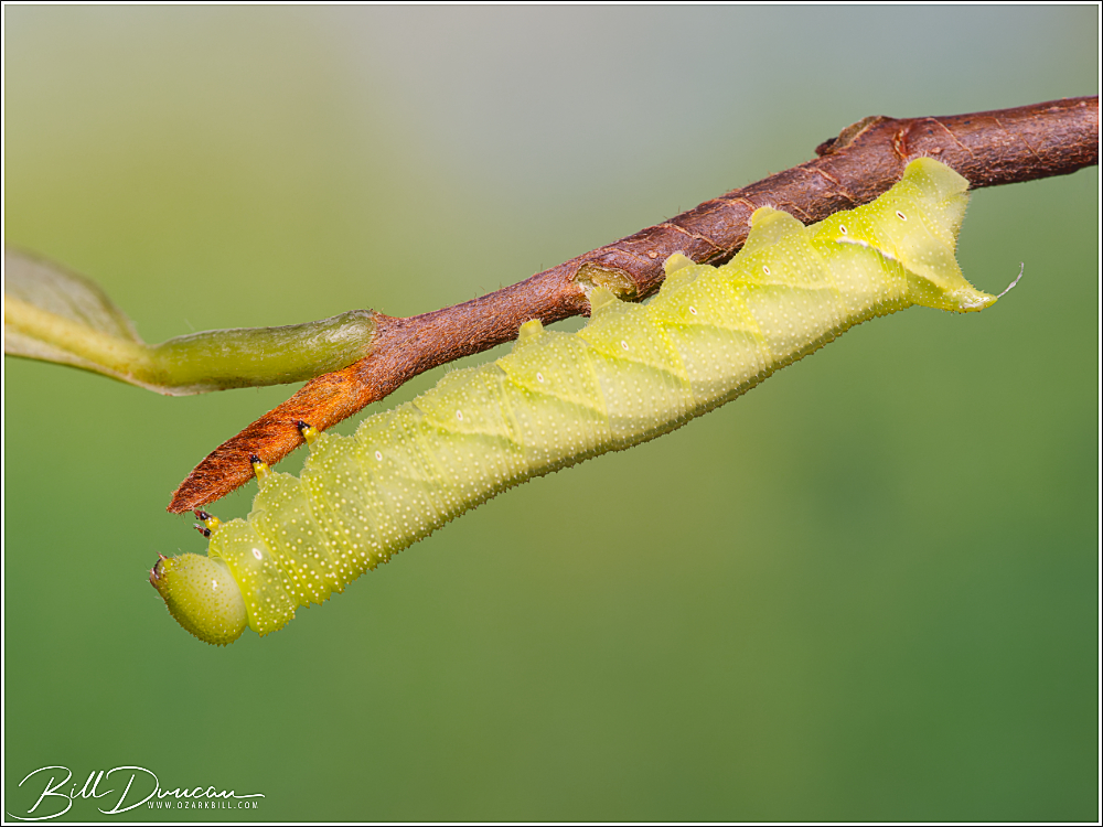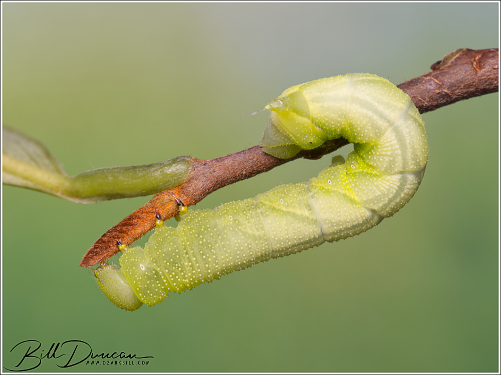 Today’s caterpillar is from another monotypic genus in the family Sphingidae. The pawpaw sphinx (Dolba hyloeus) hosts not only on pawpaw (Asimina triloba), but also on hollies-Ilex and blueberries-Vaccinium. This animal was found on A. triloba in early August at Babler State Park in St. Louis County, MO.