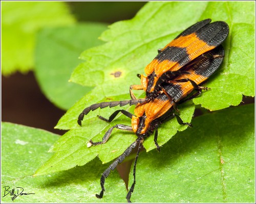 The banded netwing beetle (Calopteron reticulatum) are easy to find, often located in the open atop vegetation. They rely on aposematic coloration to advertise that they carry aboard chemical compounds that make them a distasteful meal.