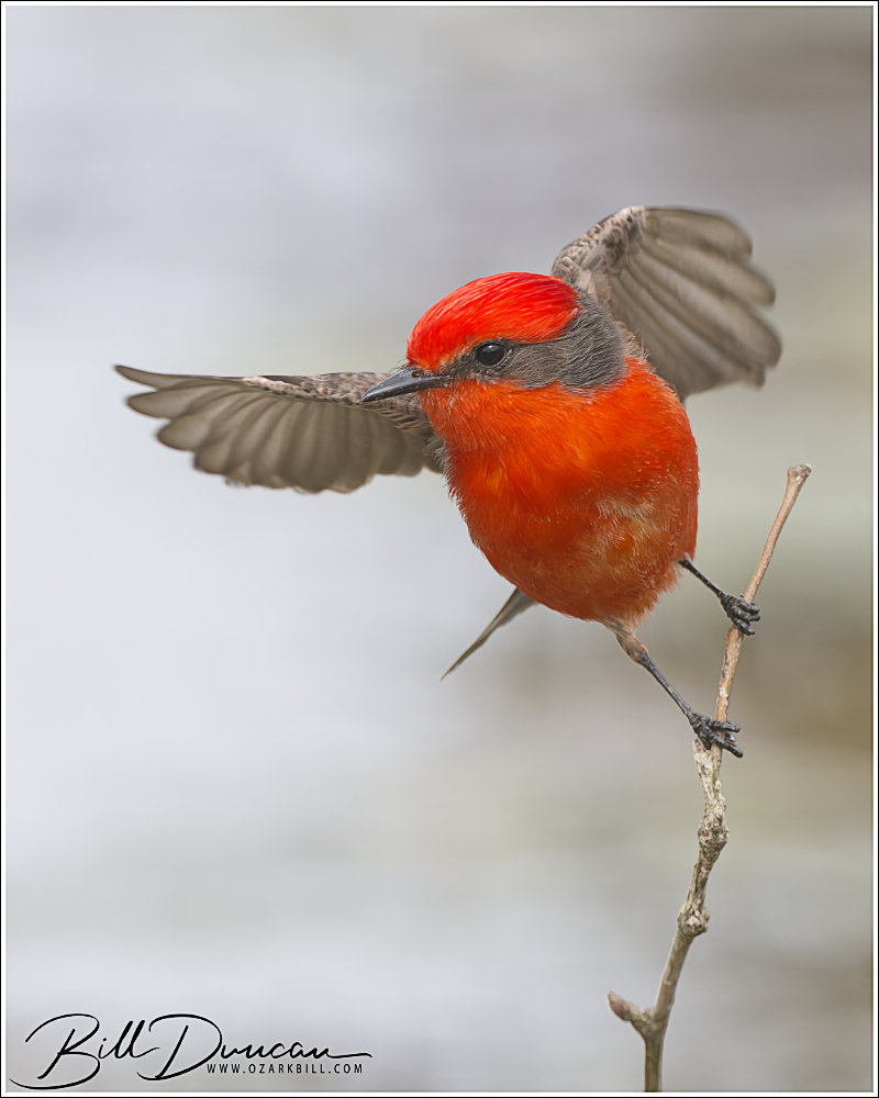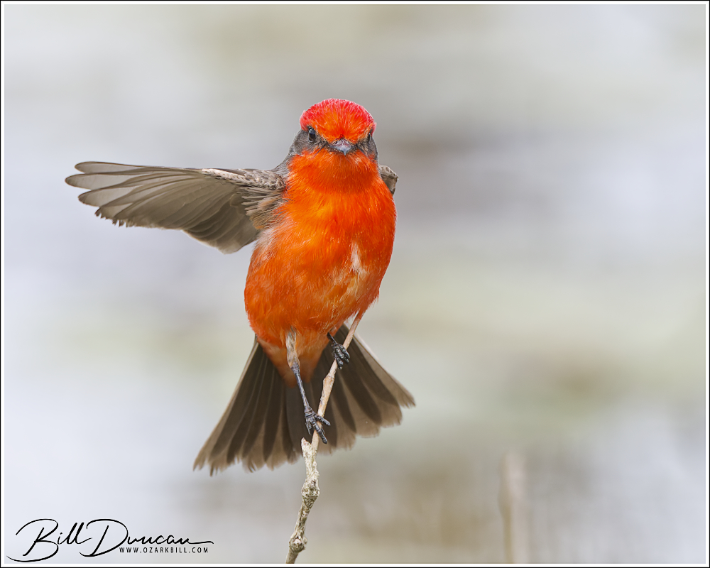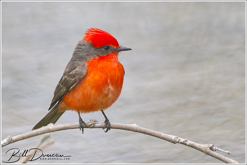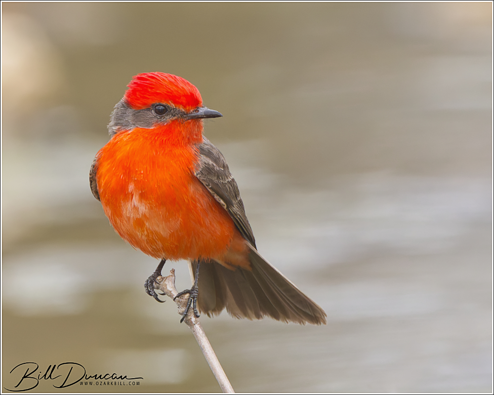 The Vermilion Flycatcher’s typical range includes much of South and Central America. It is also found in the southwestern U.S. states like Texas, Arizona, and New Mexico. Chances are likely that this bird was pushed along with a series of storms that moved through Missouri in the last week. Appropriately, this bird’s genus name, Pyrocephalus, means “fire-headed.”