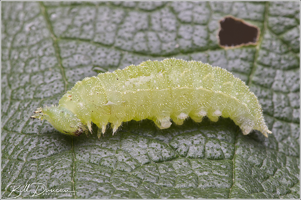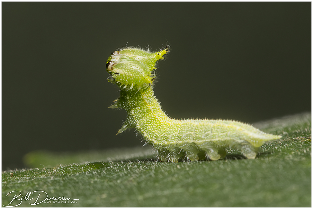 Usually by the late season cat hunts, hackberry trees (Celtis sp.) have all but dropped their leaves or look as though they should. Once I started beating branches of hackberries this summer, I found that the two species of Asterocampa (Nymphalidae) found in Missouri were quite easily found. Not only are the hackberry butterfly adults beautiful, but I find the caterpillars to be extremely cute as I hope you can agree with the photos below of the hackberry emperor (Asterocampa celtis).