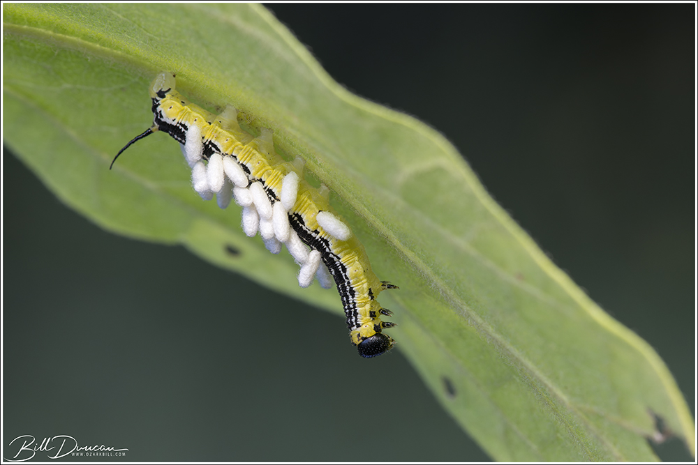 Miguel and I found an aggregation of the catalpa sphinx moth caterpillars on a caterpillar hunt in early September. I have been looking for this species for a while so this was a nice find. Of the ten or so we found, one was infested with the parasitoid braconid wasp cocoons. See photos below.