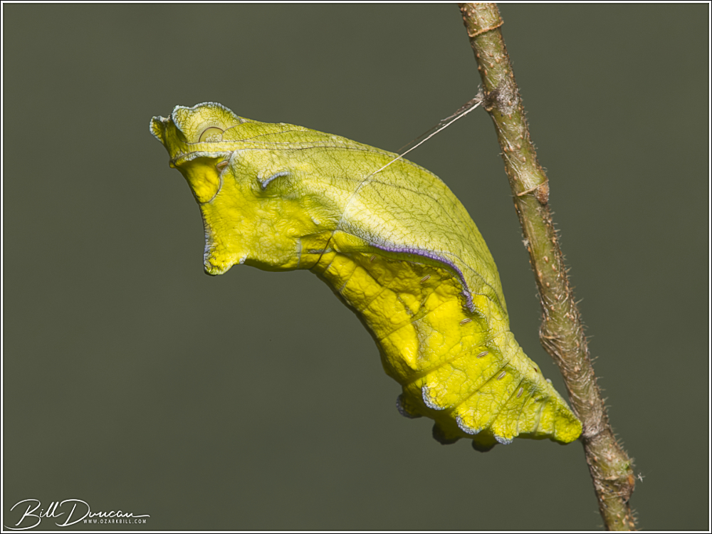 And finally, a recently finished chrysalis of the pipevine swallowtail (Battus philenor). In 10 – 20 days the adult butterfly will emerge.