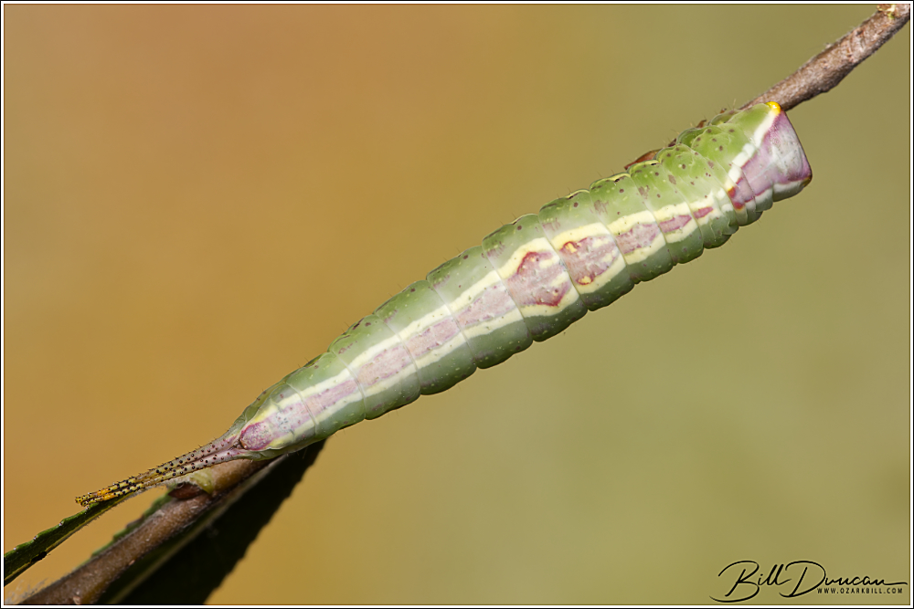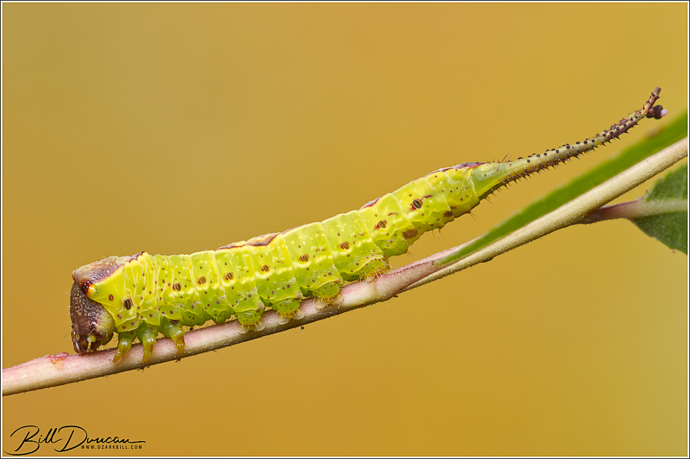 Notes: My favorite caterpillar species and one that I have not had the pleasure to find in over nine years! In all of the high-quality habitats I visit in Missouri during the late summer, I take the time to carefully investigate any greenbrier that I happen to find, always on the lookout for this magnificent creature. Imagine my surprise to find one in St. Louis County! Looking like it could have been the creation of Dr. Seuss or Tim Burton, this cat looks and behaves as though it might be a dead leaf or portion of a tendril of its greenbrier host. When disturbed, it will sway back and forth as if being simply a piece of detritus moving with the wind.