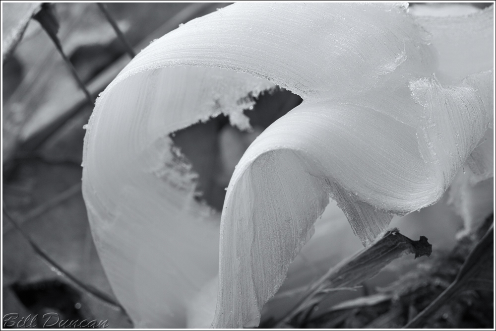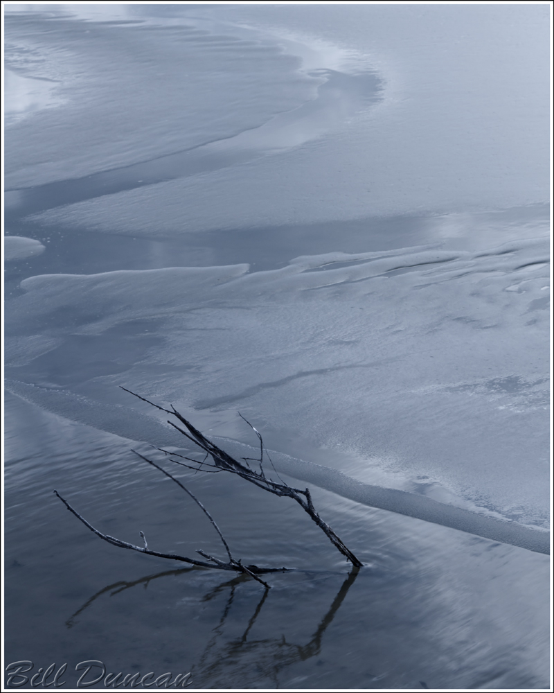 Photographing ice is a nice challenge for the nature photographer.  Negotiating the landscape itself when covered in snow and ice is the first obstacle and finding safe passage in both transporting yourself to the scene and then within the scene is obviously critical.  Nailing the exposure in camera is crucial in making an ice image that works compared to one that falls short – ice and snow have their obvious challenges as being bright subjects that can confuse the camera in automatic exposure modes.  Composition is a challenge, as many ice shots are all about pattern and flow through the rectangle and may not be focused on an apparent subject.  Finally, color and white balance of the image needs to be carefully scrutinized.  There are lots of options here.  Will you leave the scene cold?  This is a popular choice for winter images, or is there reason to warm it up?  Will it be in color or will you convert to B&W?  If you do go monochrome, color toning leaves you with more potential options.
