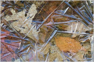 I naturally tend to process the winter images I’ve been able to produce toward the cool end, either through white balance decisions or in monochrome toning.  The image presented above is a more neutral or even warm image.  These leaves, which had fallen weeks earlier in mid-autumn were approximately two feet under the surface of this stream which runs through Hawn State Park in the beautiful St. Francois Mountains.  A layer of ice about one inch thick provided the first layer of texture and the warm mosaic the fallen leaves of the stream bottom provided another.