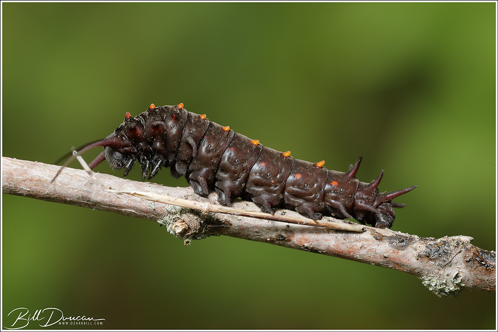 I finally lucked out and found a late instar Battus philenor. This guy was walking along a trail, presumably looking for a good spot to pupate. I persuaded it to walk on a stick for a brief period to pose for a couple of portraits and then left it where I found it.