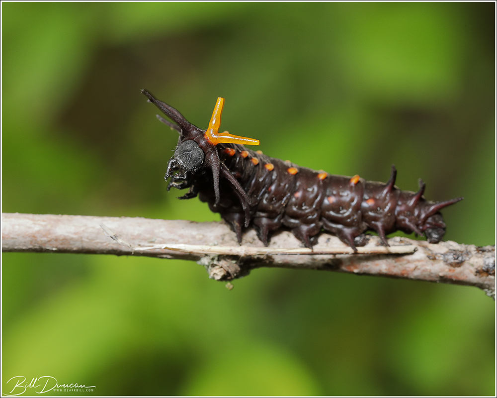 I finally lucked out and found a late instar Battus philenor. This guy was walking along a trail, presumably looking for a good spot to pupate. I persuaded it to walk on a stick for a brief period to pose for a couple of portraits and then left it where I found it.